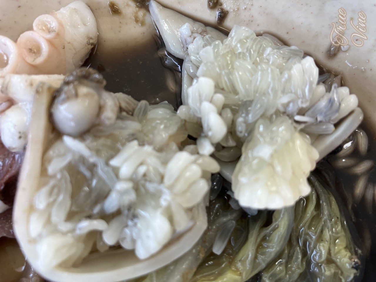 メスのタコは白くて細長いご飯粒のような卵がいっぱい入っていて、淡白で粒粒していておいしかったです。