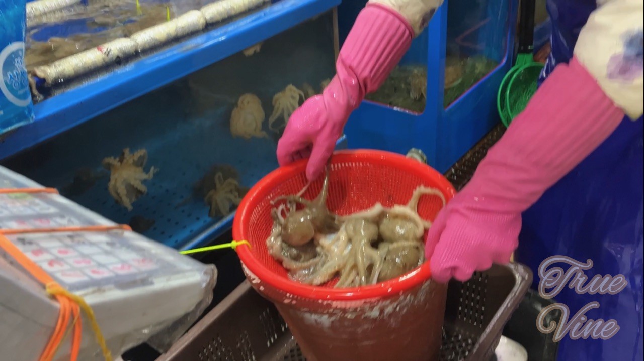 入り口近くのお店で旬のイイダコ (韓国語でチュクミ:주꾸미)を1kg注文すると、水槽から生きたタコを取り出してくれました。