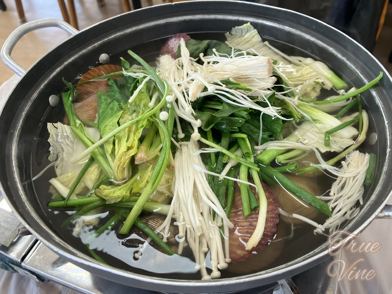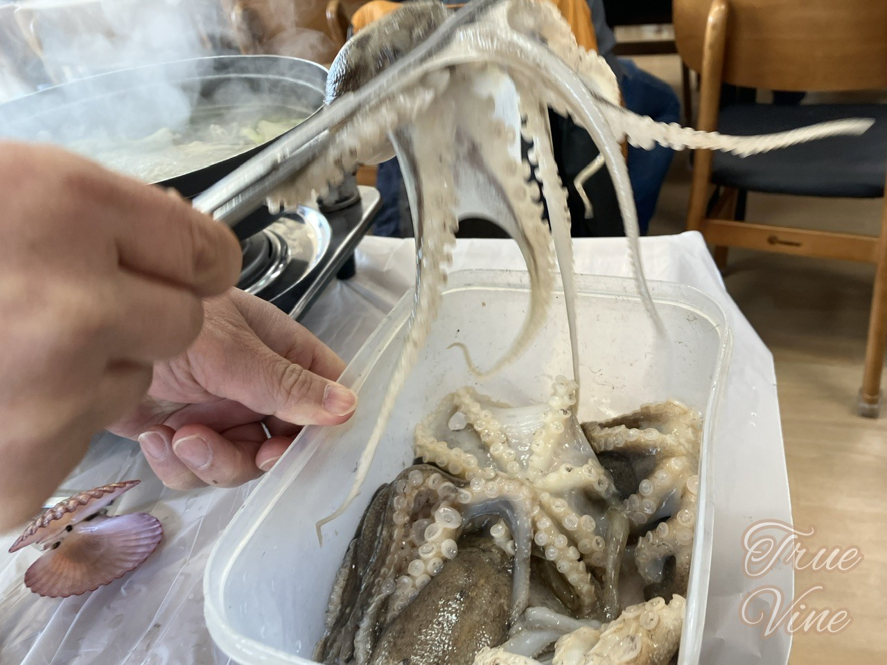 テーブルに着くと、付け合わせのおかずとさばいたホヤと洗ったタコ、鍋に野菜と一緒に貝を入れてテーブルのカセットコンロにセットしてくれました。