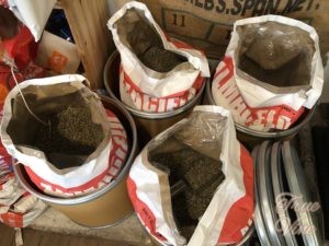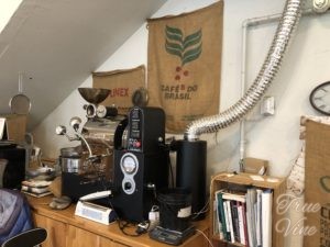 こちらのカフェは自家焙煎を行っていて、店の片隅には焙煎機と生豆の袋が置いてあります。焙煎したての新鮮な豆の販売も行っています。