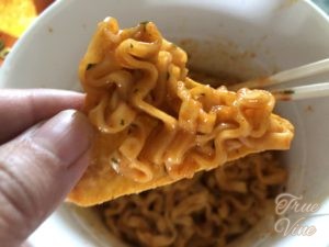 おそらく、辛い麺がナッチョに乗せられてそのまま口に入るので、味覚を感じる舌に触れる部分が少なくなり、美味しさはそのままに、辛みを感じずに食べられるのではないかと思います。